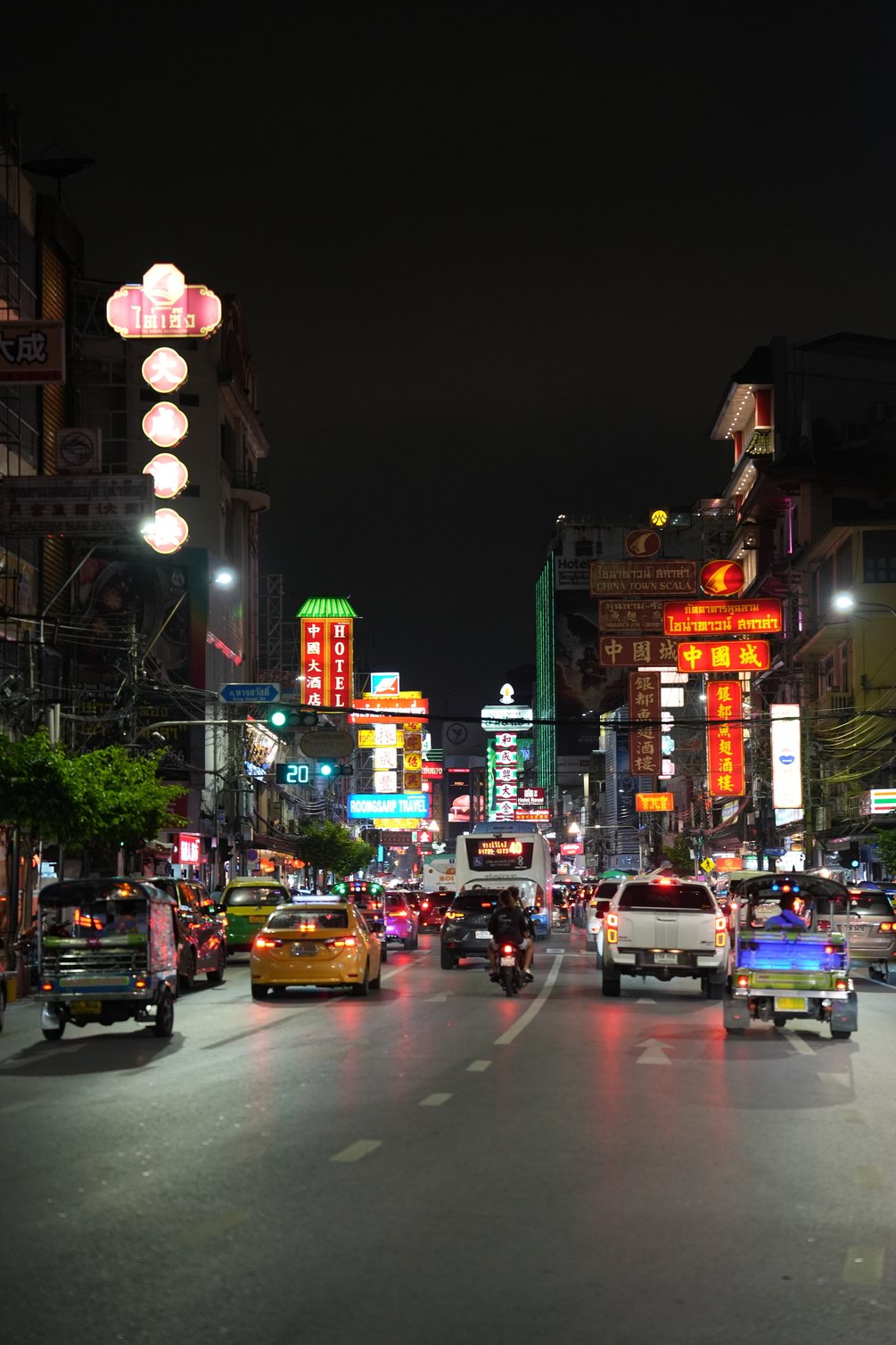 A vibrant city street at night illuminated by colorful neon signs, car headlights, and the warm glow of bustling nightlife. The image captures the dynamic energy of an urban district filled with taxis, tuk-tuks, and people moving through a lively atmosphere. The combination of vivid lights, reflections on the wet pavement, and crisp focus creates a cinematic, immersive scene that celebrates the heartbeat of the city after dark.